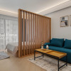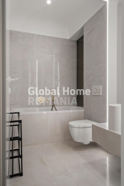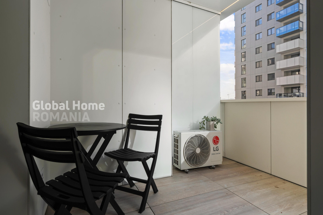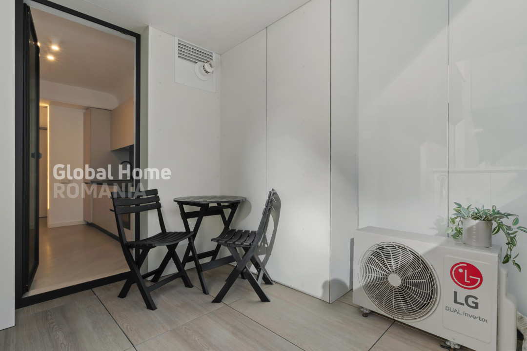 Baia este dotată cu cadă și obiecte sanitare premium, iar balconul este amenajat cu măsuță și scaune, oferind un spațiu plăcut pentru relaxare. Apartamentul este completat de mașină de spălat rufe, aspirator, TV, internet și Wi-Fi, toate perfect echilibrate cu design-ul modern al studioului.