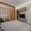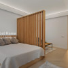 The living area includes a smartly separated sleeping area, with the bed discreetly divided by a partition from the sofa bed, along with a Smart TV and LED lighting. Thermal comfort is ensured by a private heating system and air conditioning.