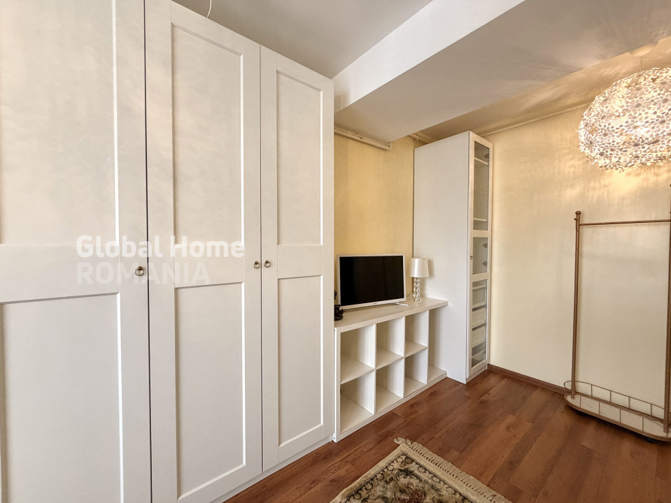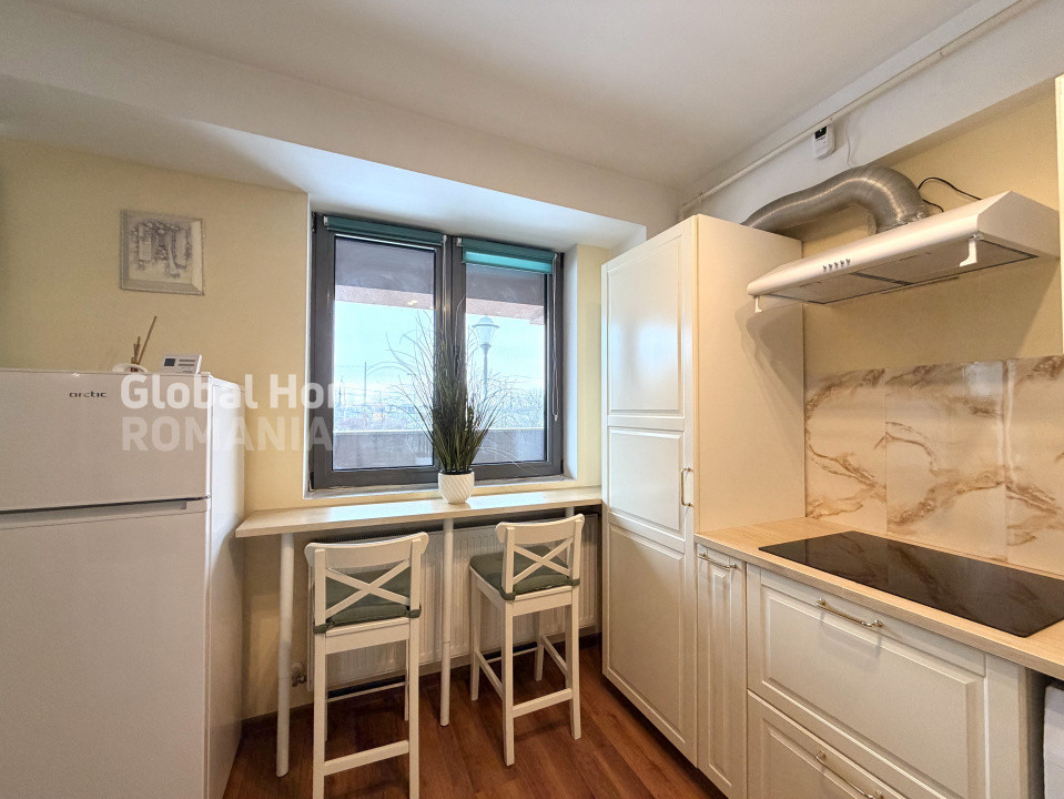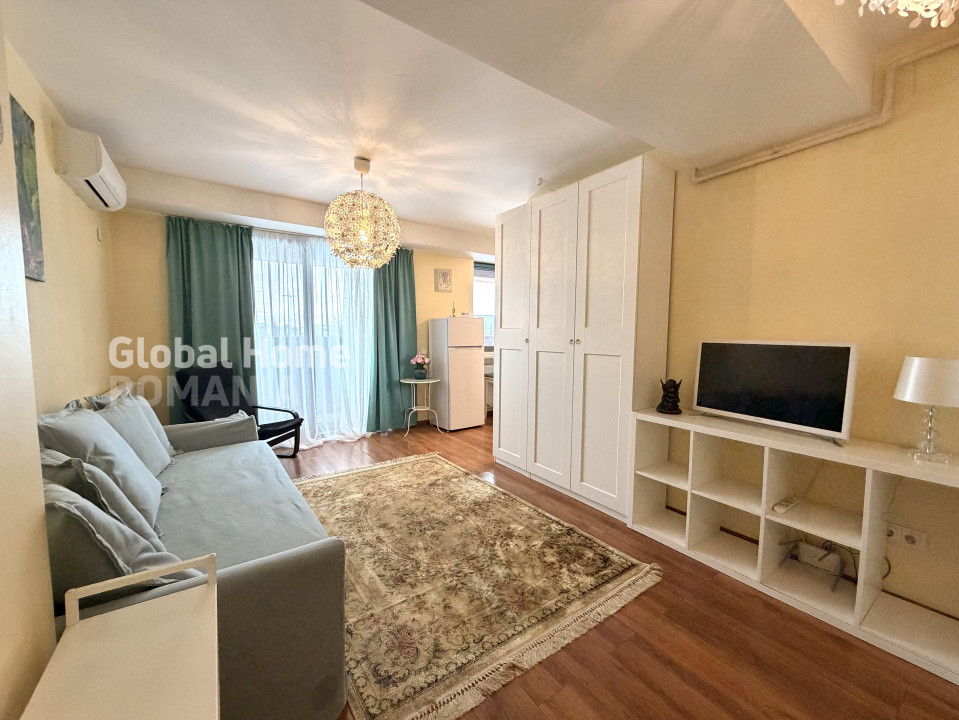 Garsoniera este complet mobilată și utilată, cu zonă de zi generoasă, spații de depozitare bine integrate și bucătărie funcțională. Bucătăria este echipată cu plită, hotă, mașină de spălat rufe și frigider, iar zona de living beneficiază de aer condiționat și lumină naturală din plin. Baia este dotată cu cadă și finisaje neutre, ușor de întreținut.