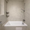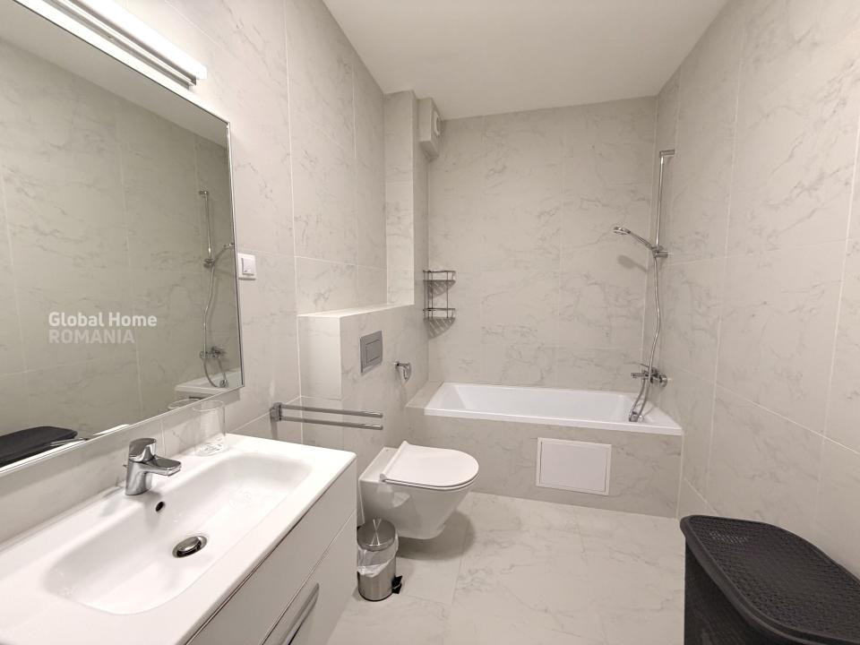 • baie modernă, cu placări ceramice tip marmură, cadă, mașină de spălat rufe și obiecte sanitare contemporane