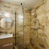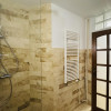 Dispune de duș tip walk-in, completat de paravan din sticlă.