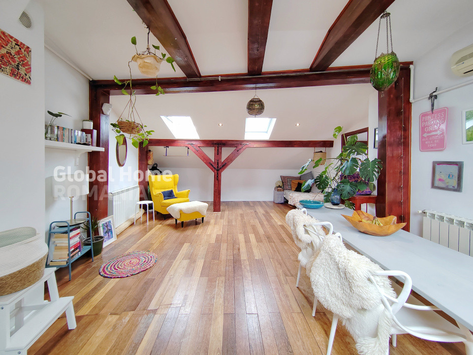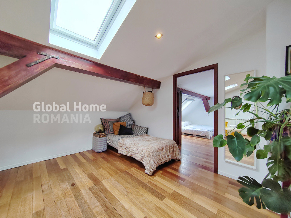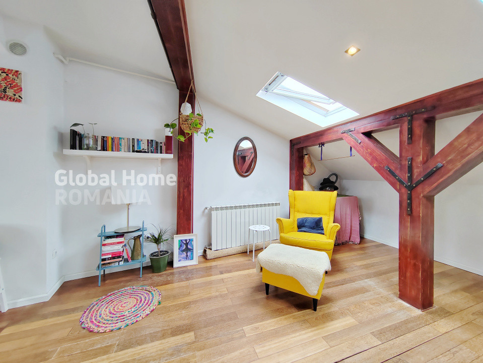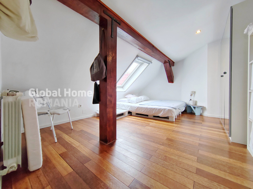 – Etaj: mansardă într-o vilă cu curte interioară