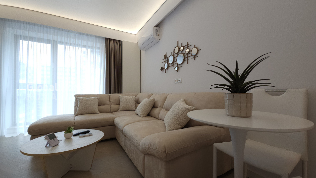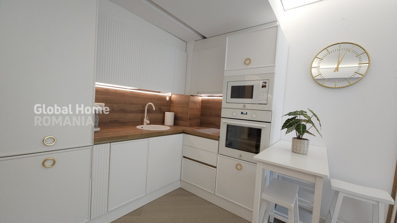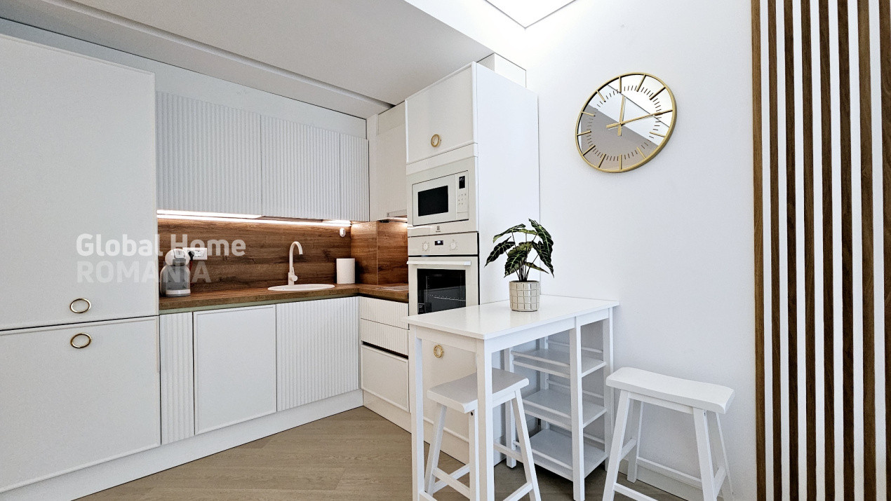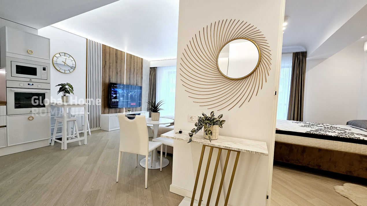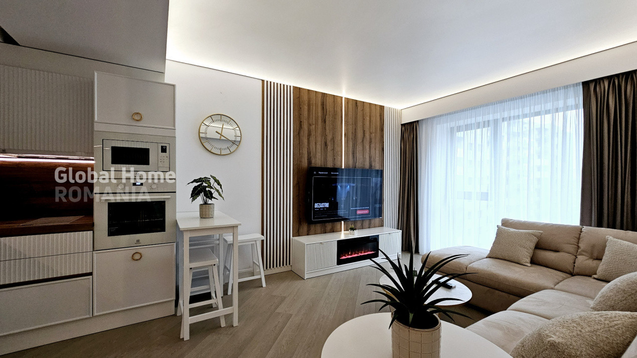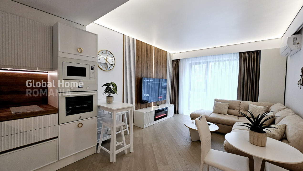 Living generos luminat natural, cu ferestre mari şi pardoseală elegantă, conturat excelent prin mobilierul deosebit ales, armonizat perfect cu bucataria open space si zona de dinning, dormitor ce confera un refugiu confortabil pentru odihnă şi relaxare, hol de acces cu multiple spatii de depozitare si 1 baie spatioasa dotata cu finisaje moderne şi accesorii de calitate. Intregul spatiu interior a fost extrem de bine eficientizat cu locuri de depozitare generoase.