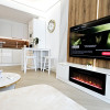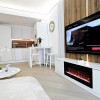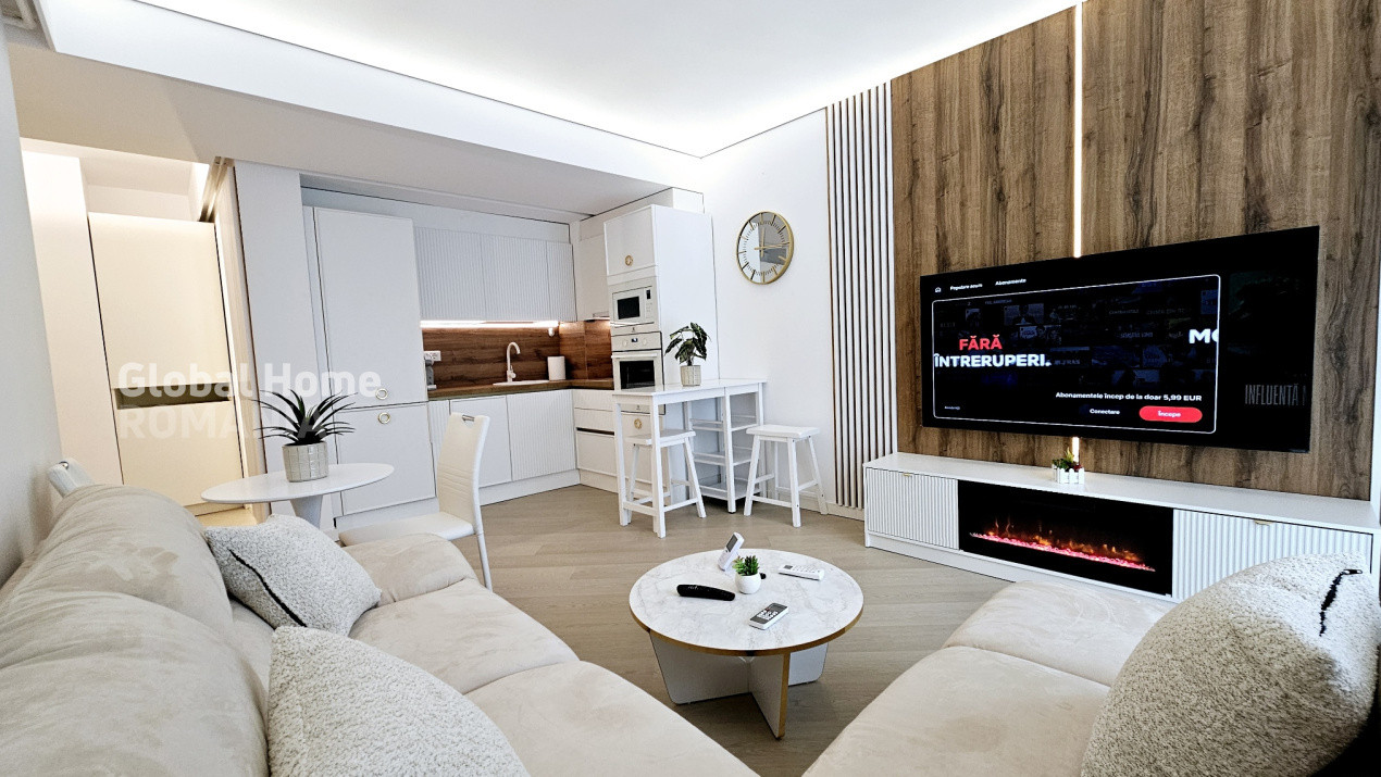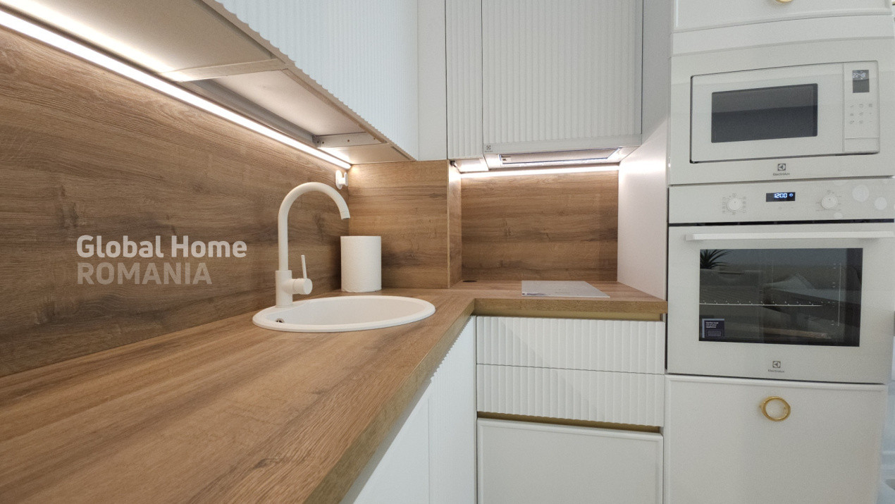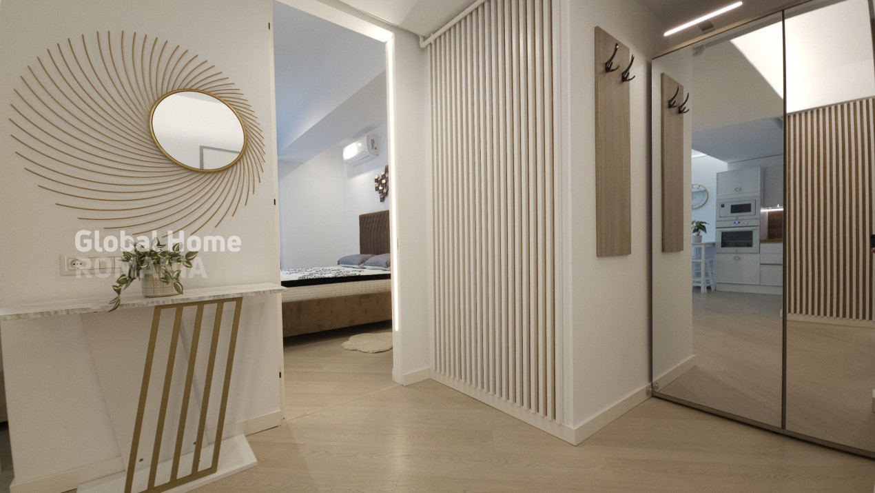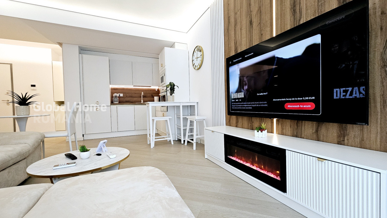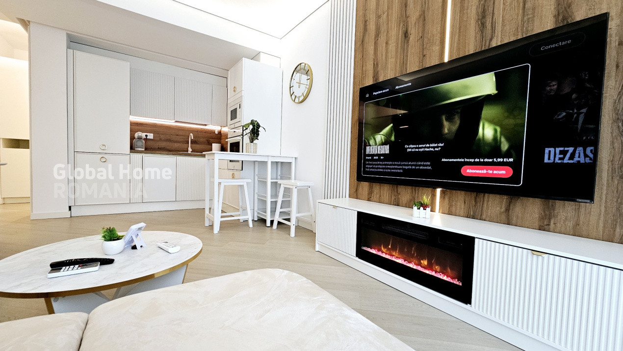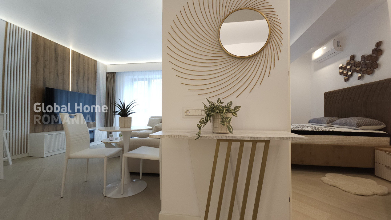 Living generos luminat natural, cu ferestre mari şi pardoseală elegantă, conturat excelent prin mobilierul deosebit ales, armonizat perfect cu bucataria open space si zona de dinning, dormitor ce confera un refugiu confortabil pentru odihnă şi relaxare, hol de acces cu multiple spatii de depozitare si 1 baie spatioasa dotata cu finisaje moderne şi accesorii de calitate. Intregul spatiu interior a fost extrem de bine eficientizat cu locuri de depozitare generoase.