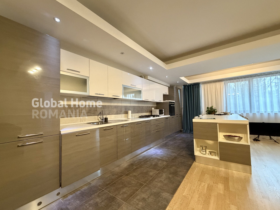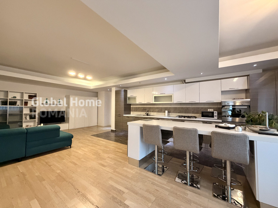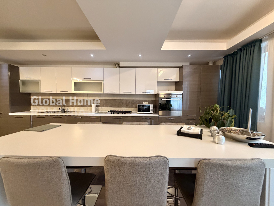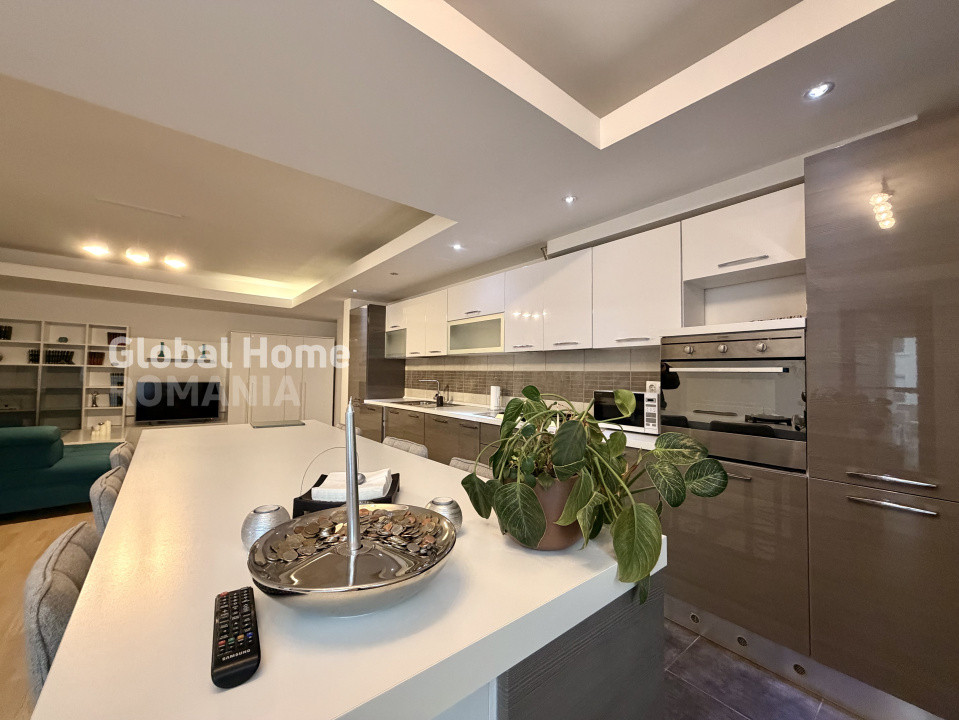 ✔ Bucătărie open-space, complet echipată, cu mobilier modern, electrocasnice încorporate și zonă de dining;