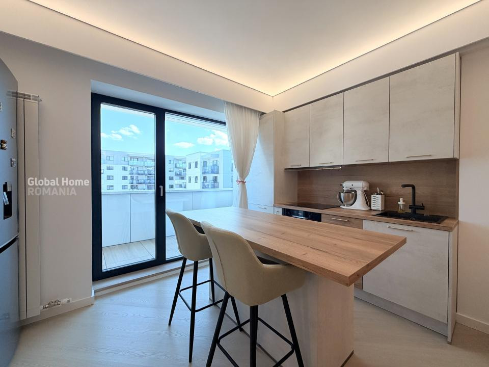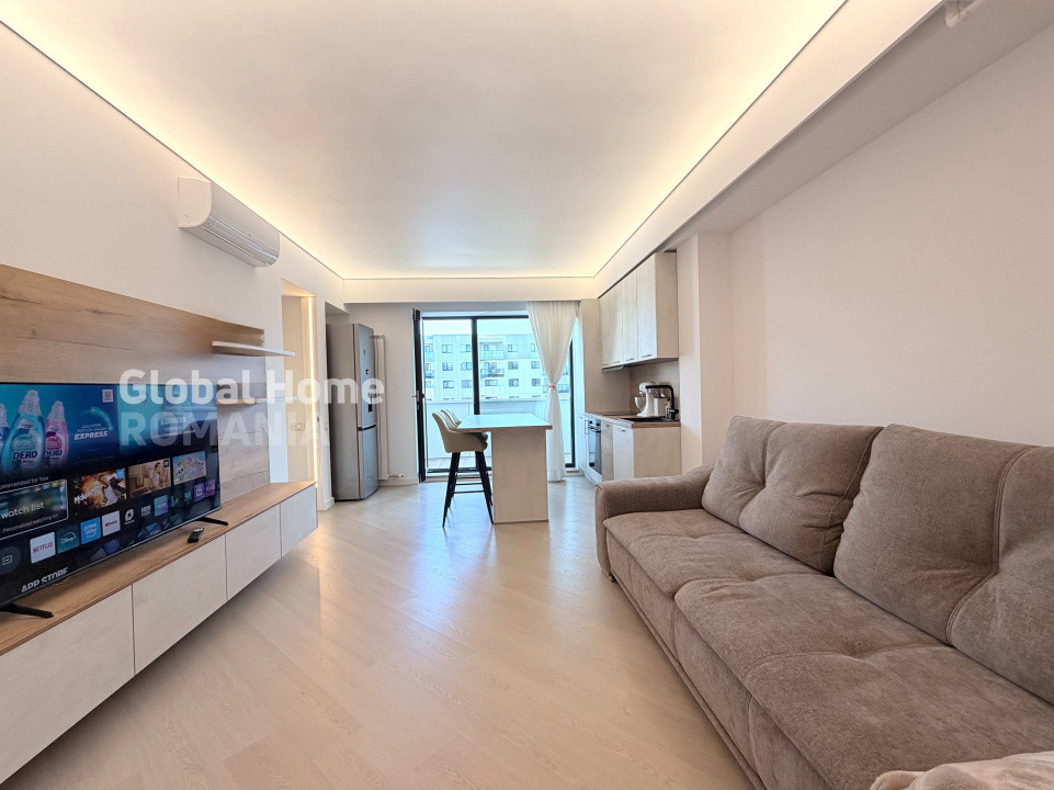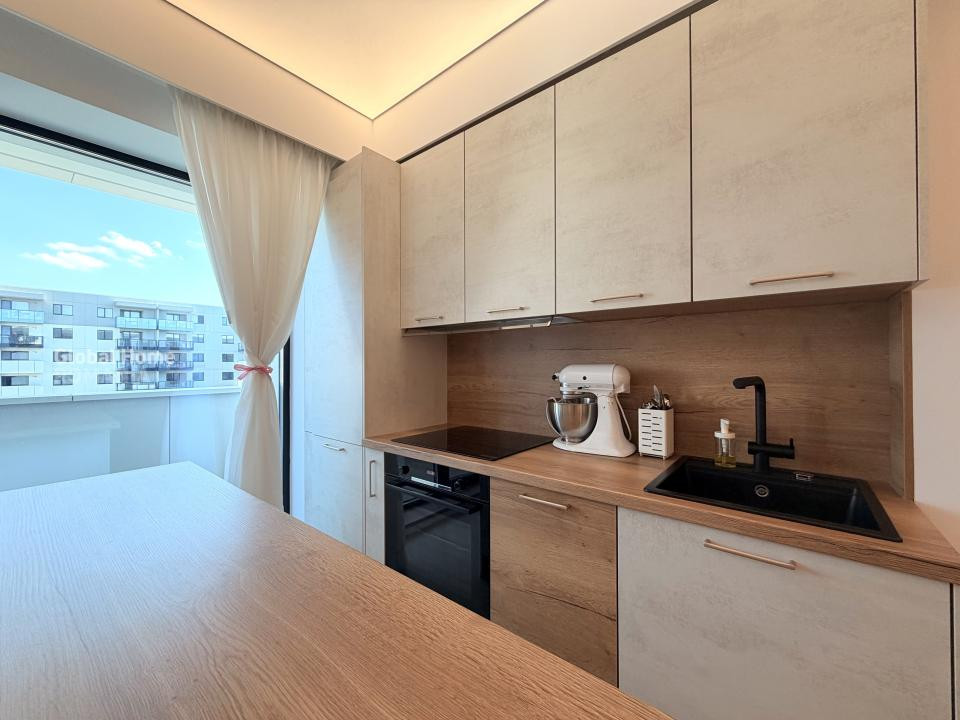 Apartamentul de 2 camere beneficiază de finisaje de calitate superioară și design modern. Mobilier premium, inclusiv bucătărie cu insulă, pat cu ladă de depozitare și canapea extensibilă. Electrocasnice de top: Două aparate de aer condiționat, Combină frigorifică, Televizor, Plită electrică, Cuptor electric, Hotă, Mașină de spălat vase, Mașină de spălat rufe cu uscător încorporat. Spații de depozitare generoase, integrate armonios în designul interior. Balcon cu vedere asupra zonei rezidențiale, ideal pentru relaxare. Fiecare detaliu gândit pentru confort și funcționalitate maximă.