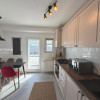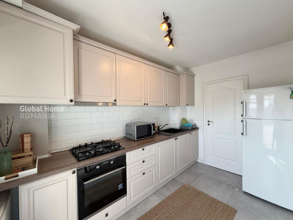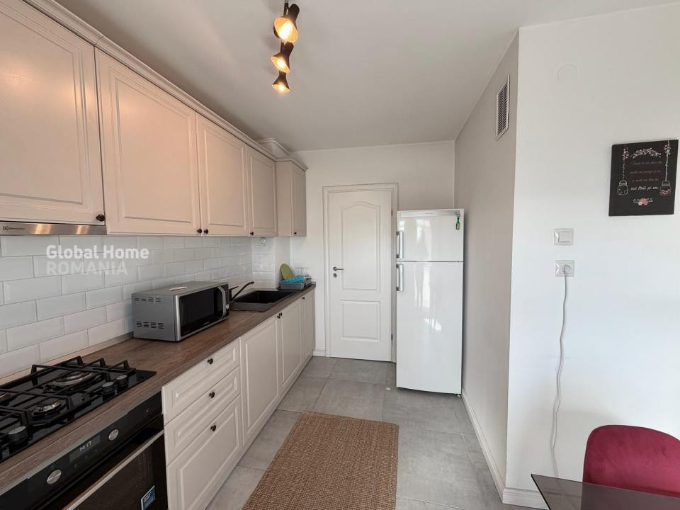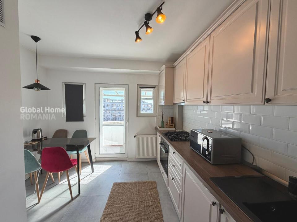 Bucătărie separată, complet mobilată și utilată, cu acces către unul dintre balcoane