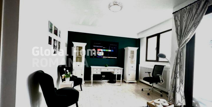 * Living: colțar Rovere, vitrine lemn masiv, birou Mobexpert, TV încastrat, fotolii Ikea, mese cafea, covor, scaun ergonomic