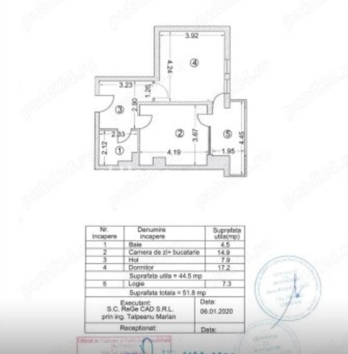 Imobilul dispune de o suprafata utila de 44,5 mp plus o terasa de 7,3 mp, insumand 51,8mp.