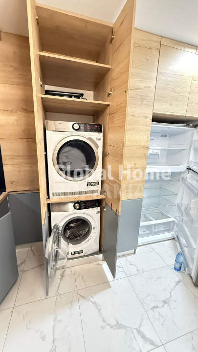 - Bucatarie complet echipata: frigider, plita electrica, cuptor electric, hota, masina de spalat vase