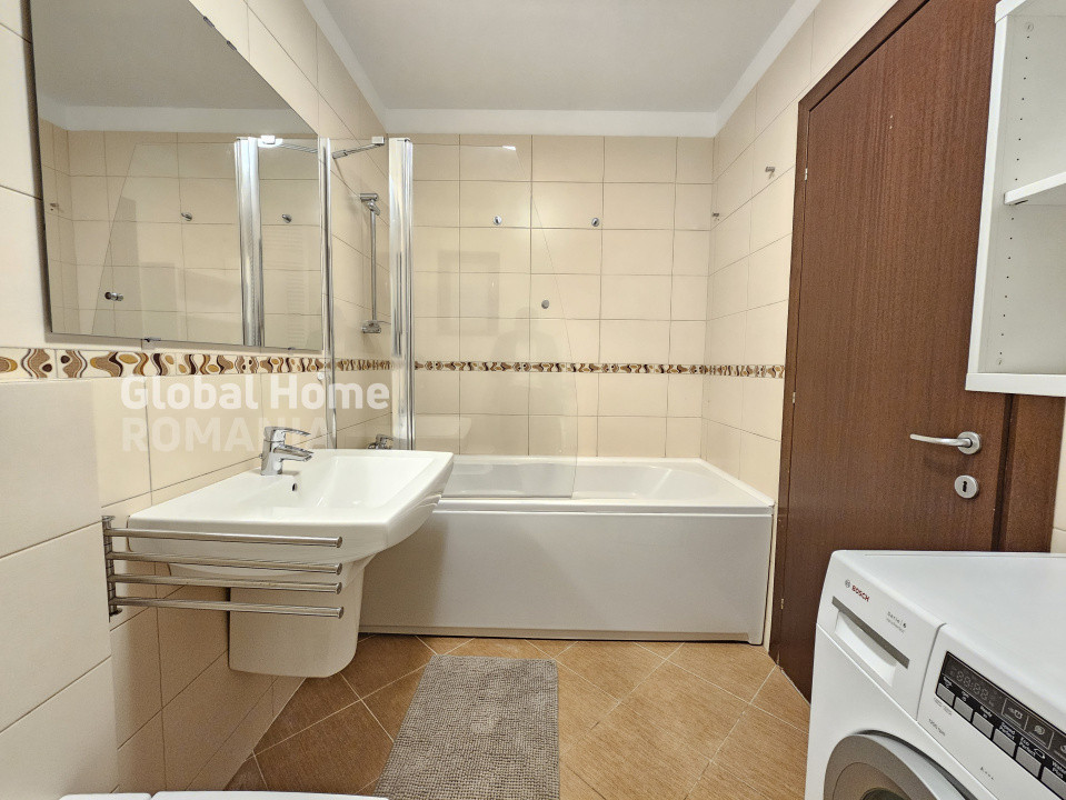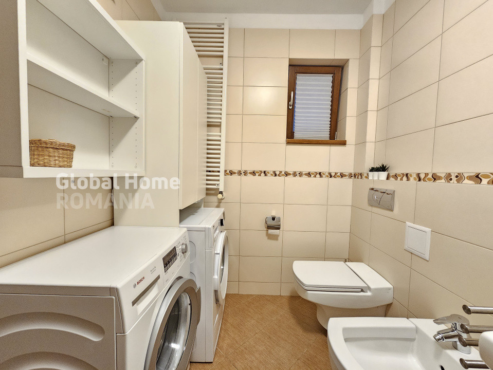 - Complet mobilat și utilat, cu electrocasnice încorporate Bosch: plită pe gaz, cuptor, cuptor cu microunde, frigider, mașină de spălat vase, mașină de spălat rufe și uscător