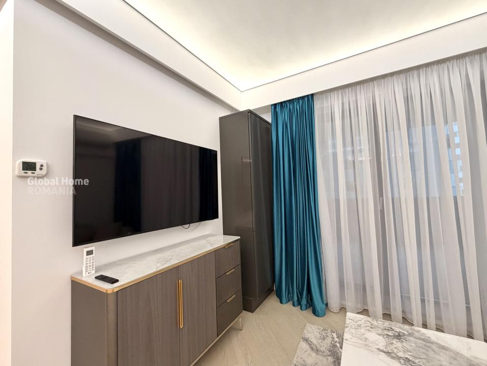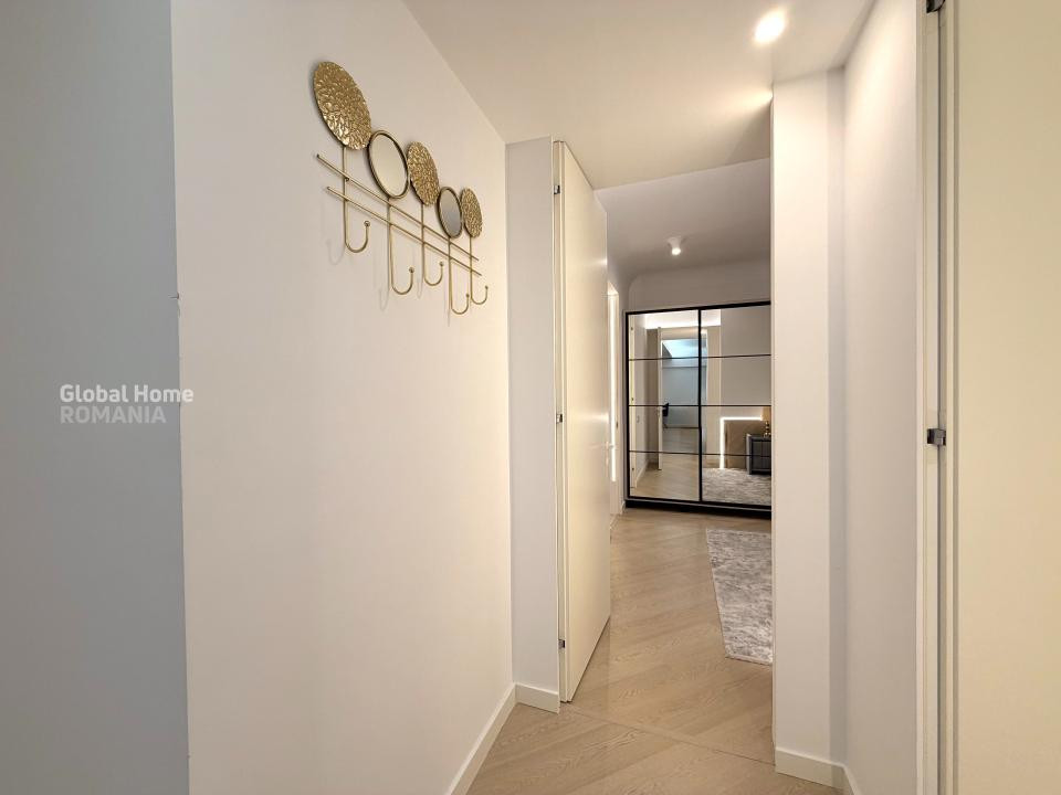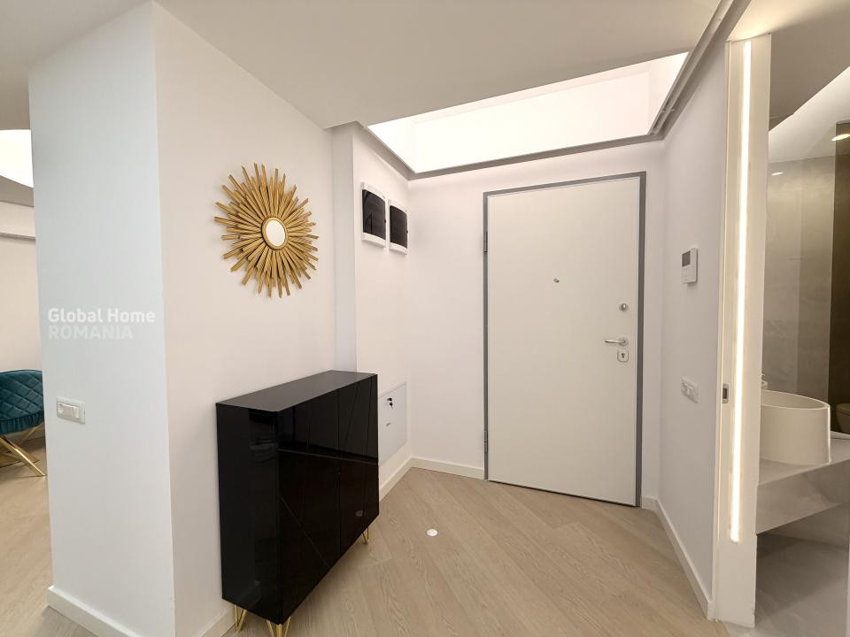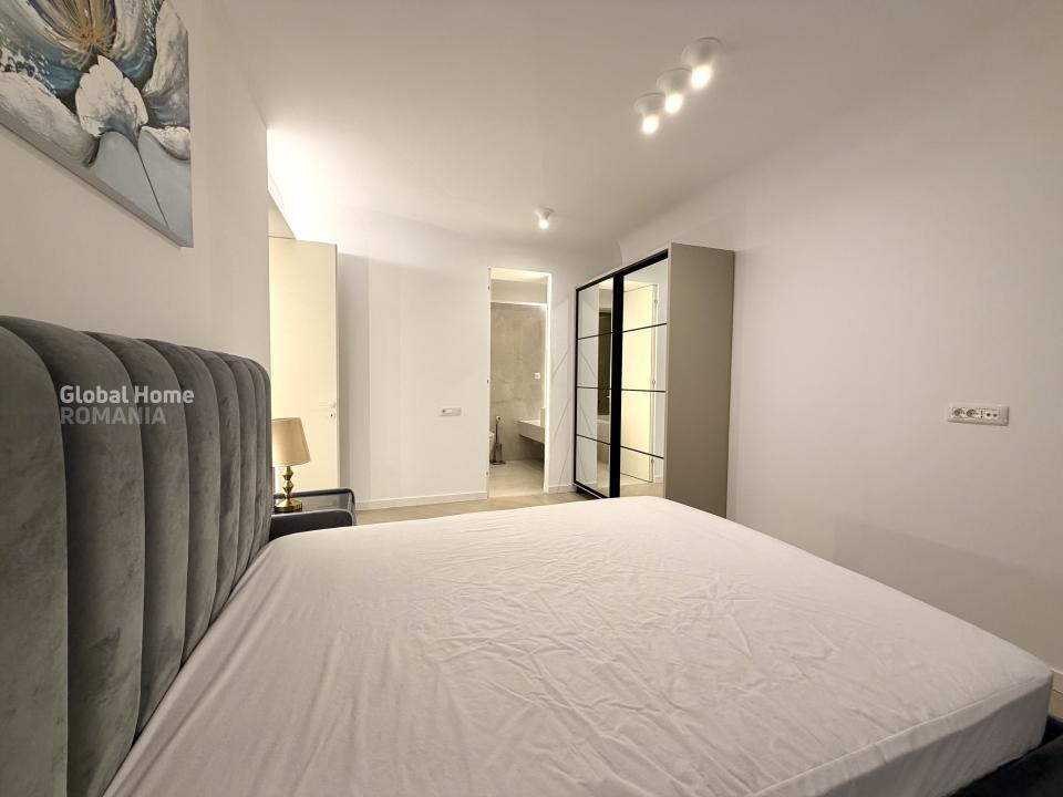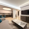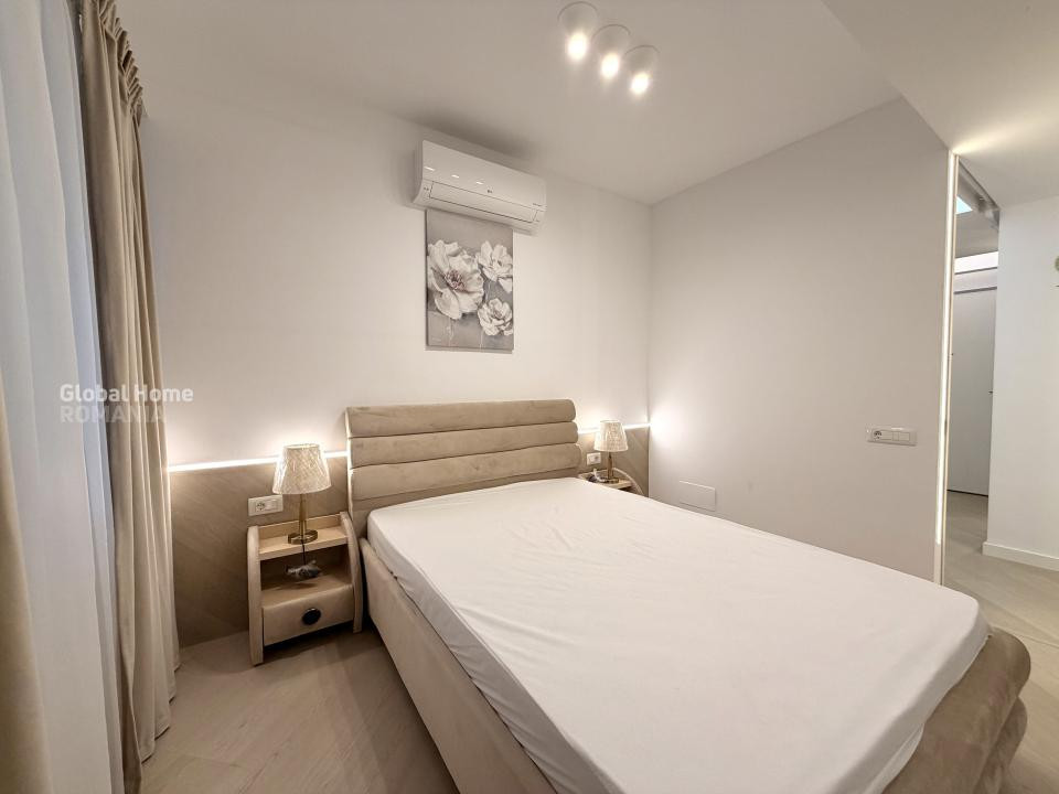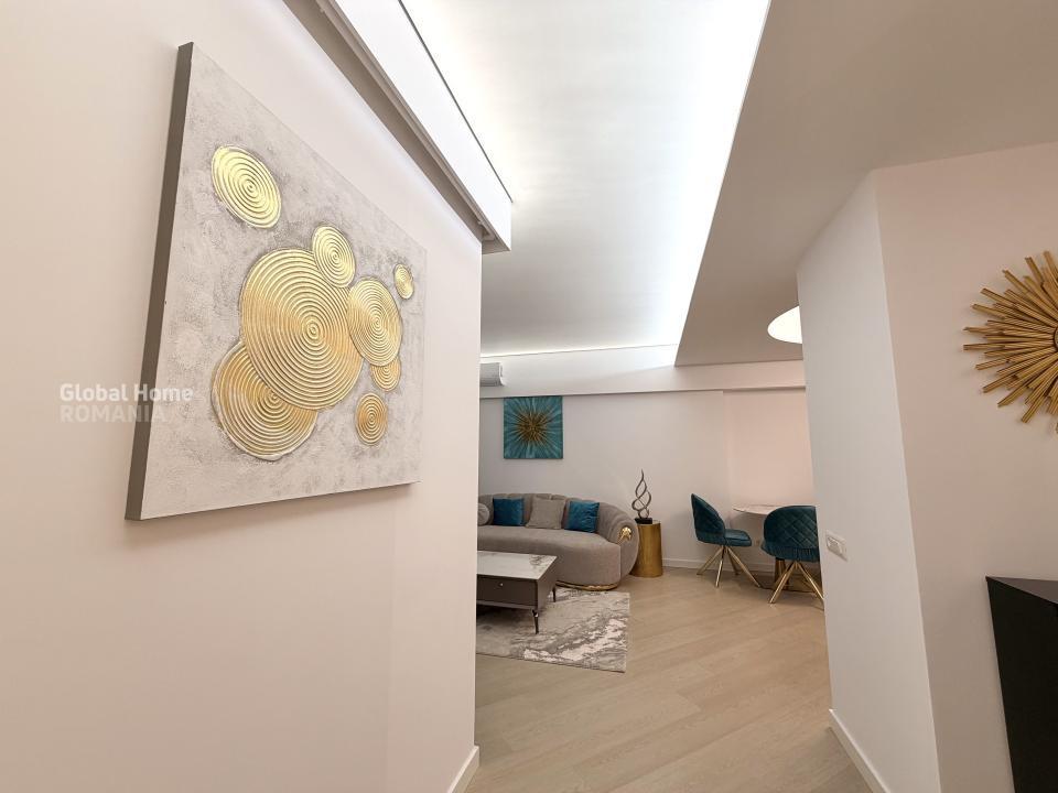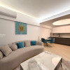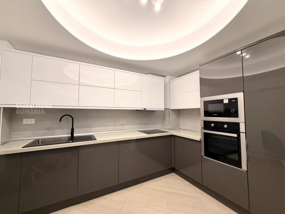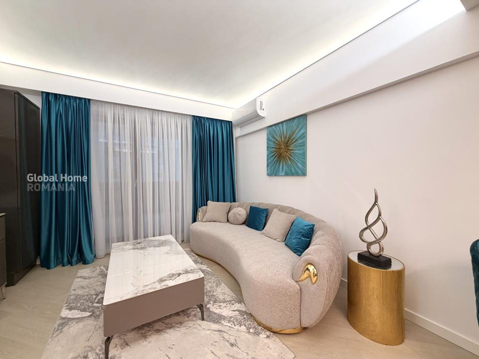 Apartamentul este complet mobilat și utilat, amenajat într-un stil contemporan, cu accent pe detalii, materiale premium și iluminat ambiental. Zona de living este spațioasă și luminoasă, integrând armonios zona de relaxare cu dining-ul și bucătăria open-space complet echipată, cu electrocasnice încorporate și mobilier modern.