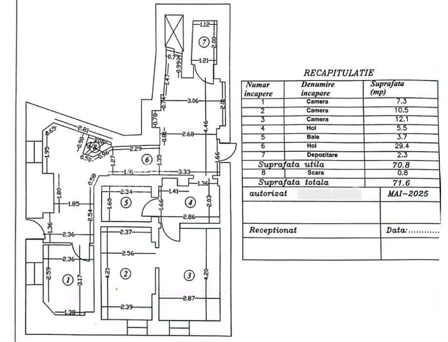 Spațiul are o suprafață utilă totală de 70,8 mp și este compus din cinci camere (încăperile 1–5 conform planului), completate de un hol de acces comun (încăperea 6) care asigură circulația facilă către zonele de la etaj. Compartimentarea este practică și funcțională, cu încăperi bine proporționate și ferestre care oferă lumină naturală și posibilitate de aerisire.