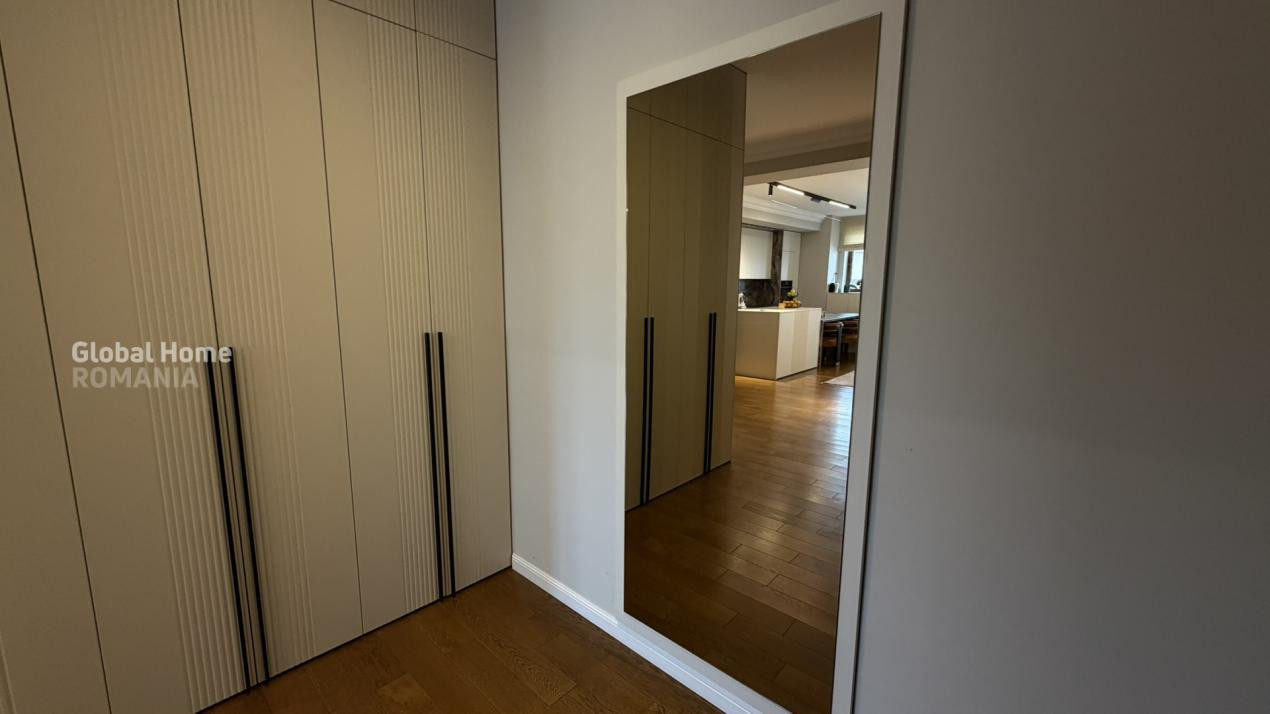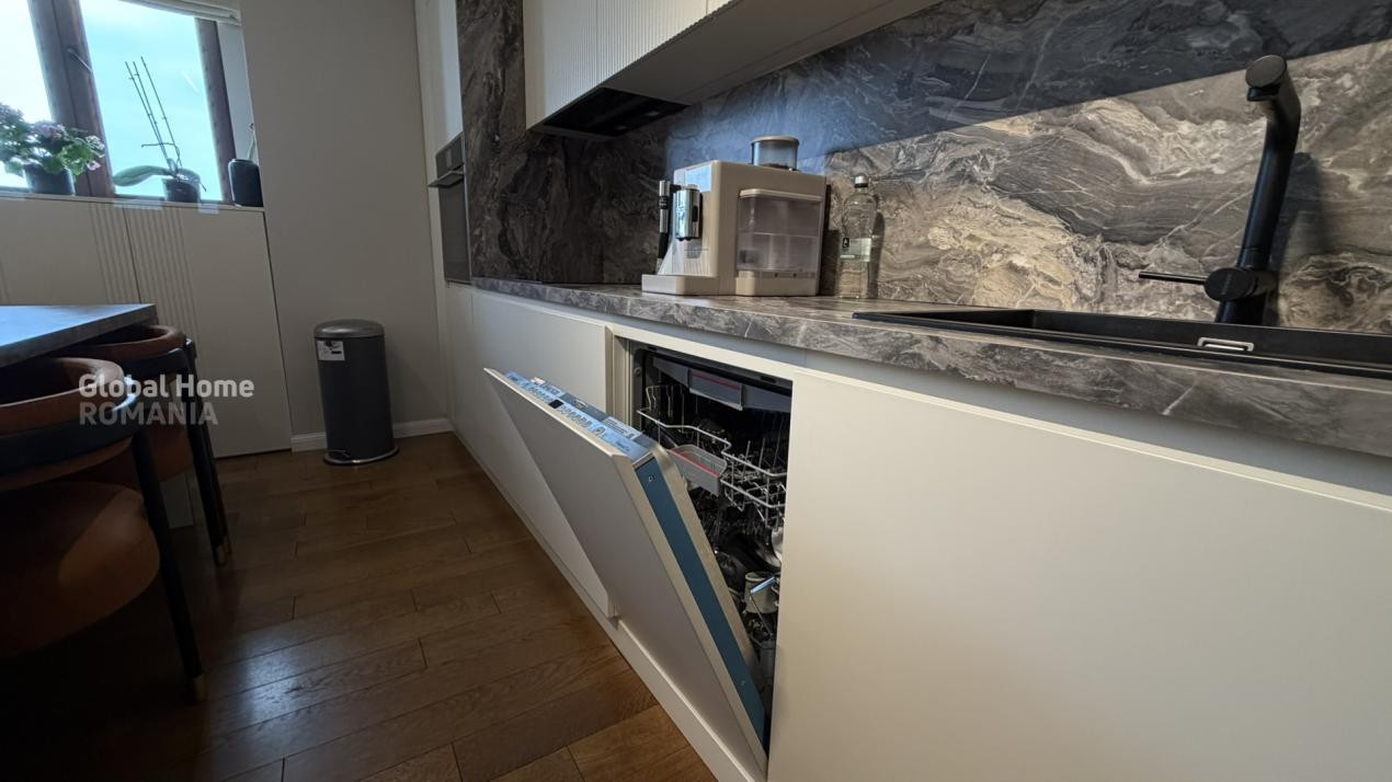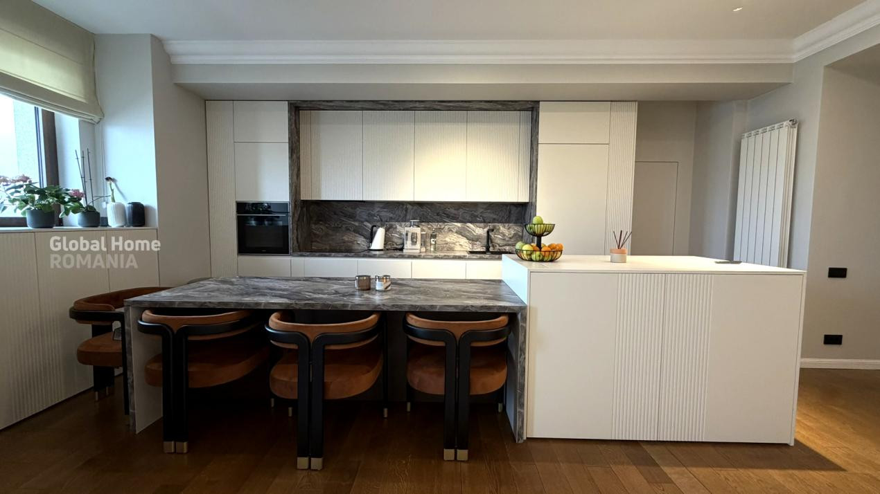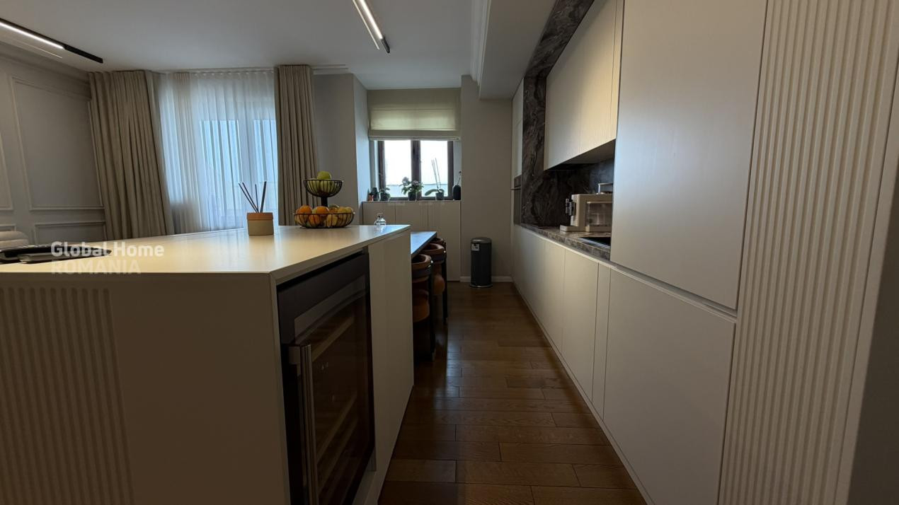 Se vinde complet mobilat și utilat, cu electrocasnice premium: plită și mașină de spălat vase Bosch, cuptor și hotă Teka, mașină de spălat rufe Bosch, uscător Miele, mini-bar și răcitor de vinuri Teka, TV LG OLED și videointerfon.