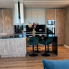 Bucătărie open-space, complet mobilată și utilată, cu insulă și electrocasnice moderne