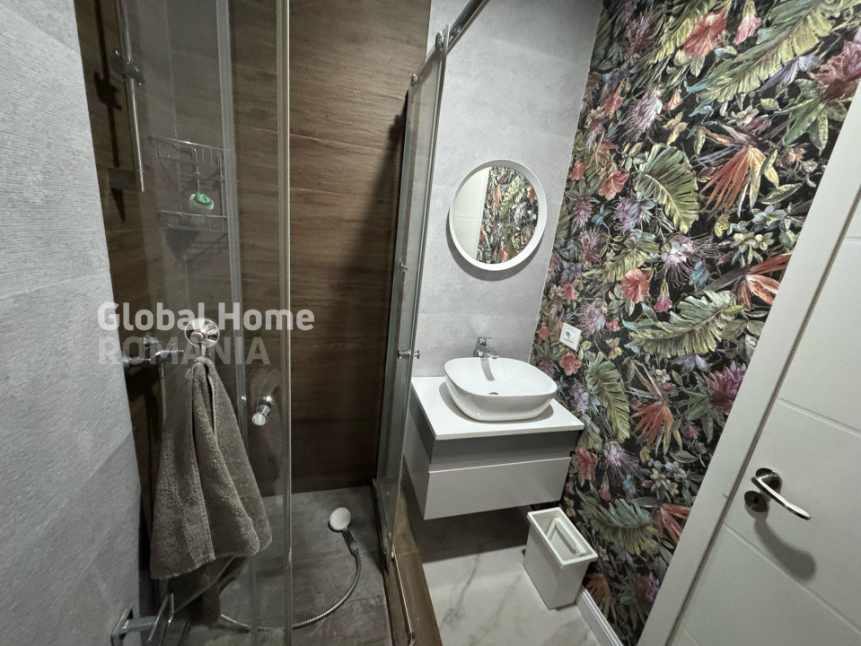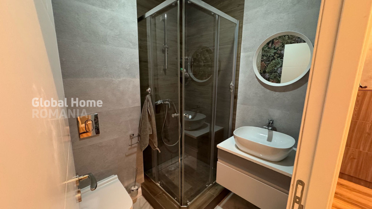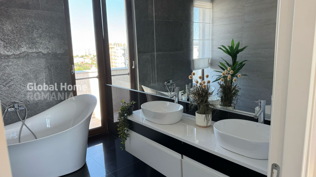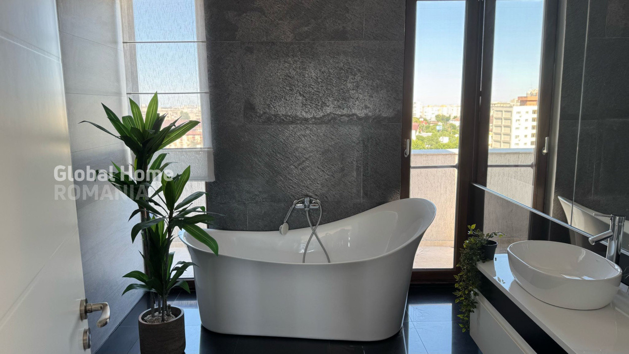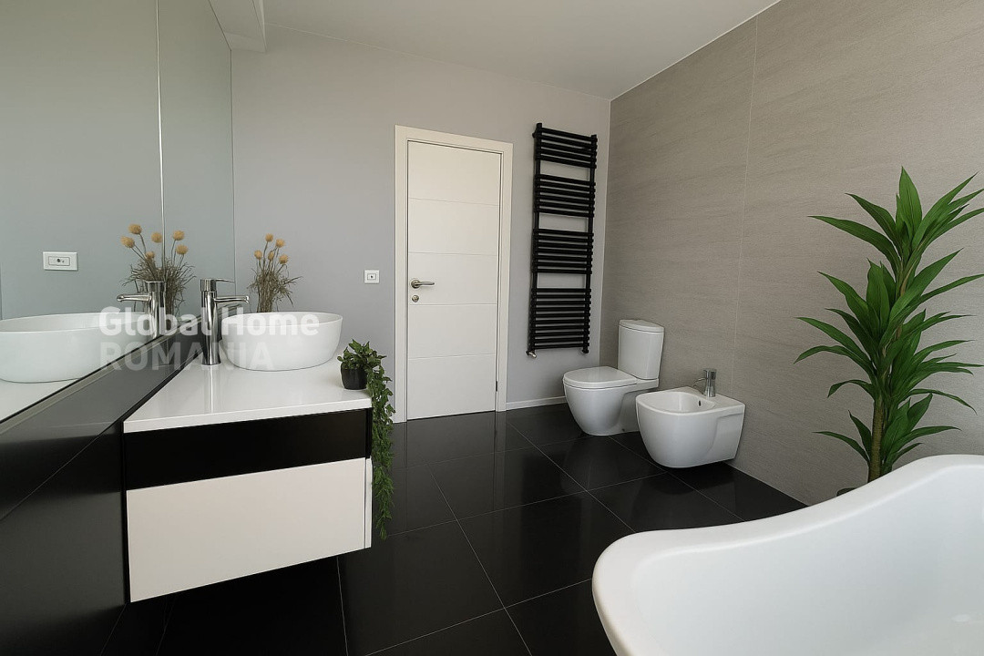 Două băi elegante, dintre care una cu cadă freestanding și finisaje premium
