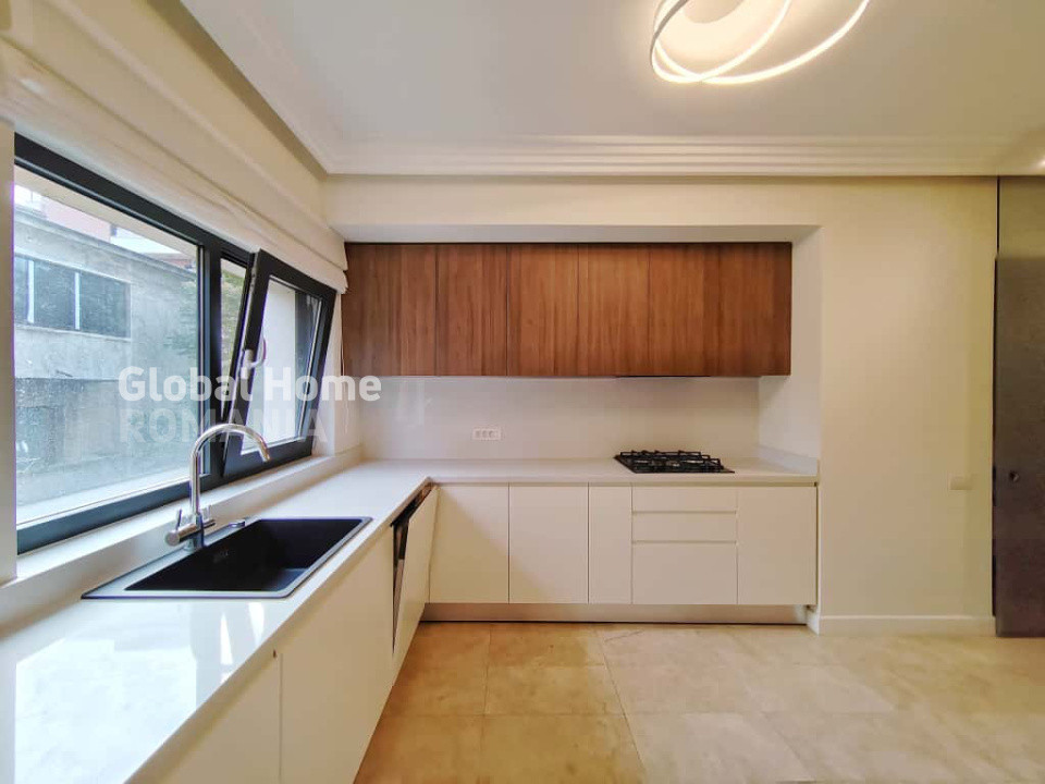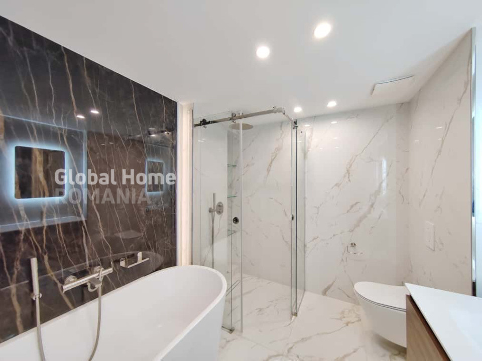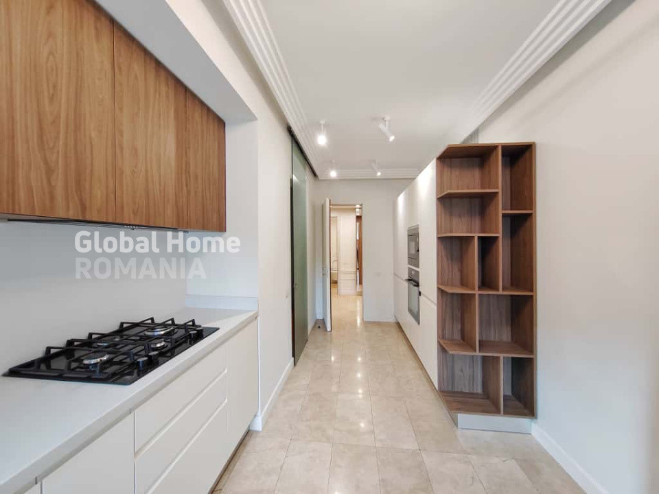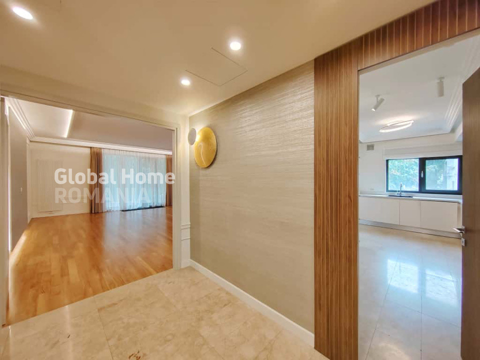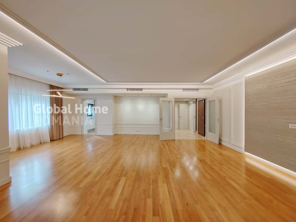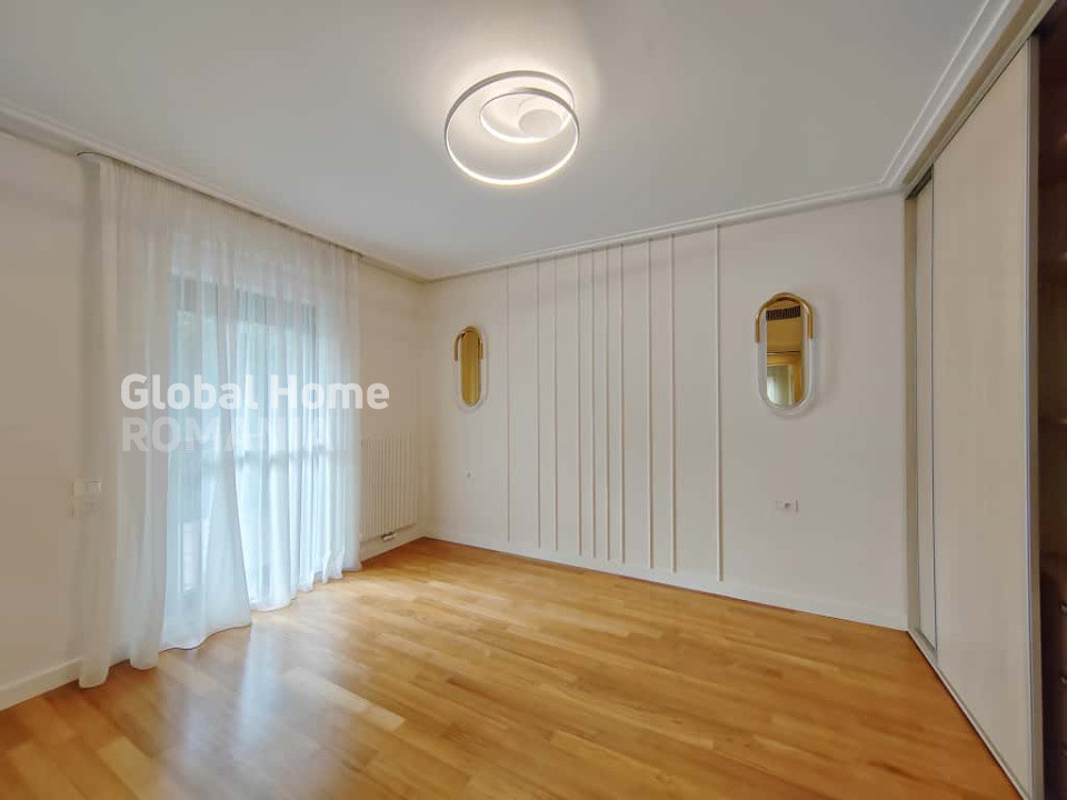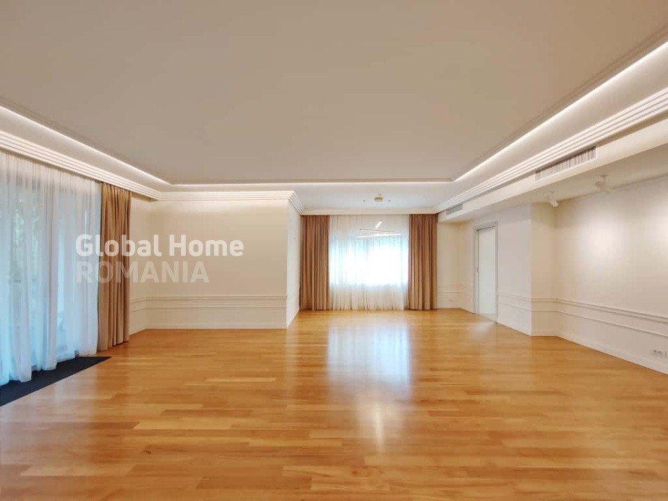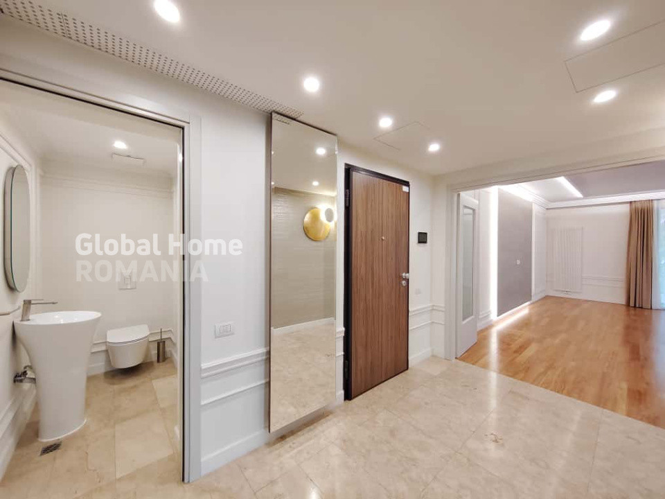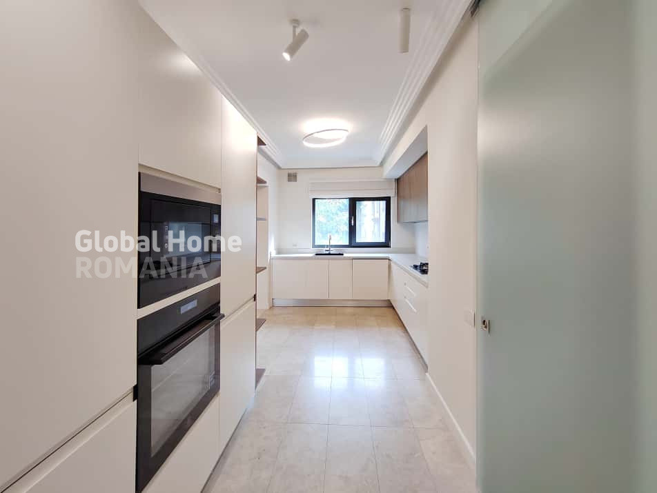 We are offering for rent an elegant 4-room apartment, fully detached, located on the 1st floor of a building with P/S+P+4E height regime. The property includes an underground parking space and a storage unit. The apartment is spacious, modern, in impeccable condition, and partially furnished, with a total surface of 180 sqm (including two terraces of 14 sqm and 9 sqm).
