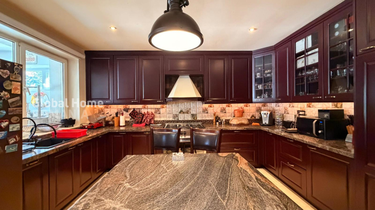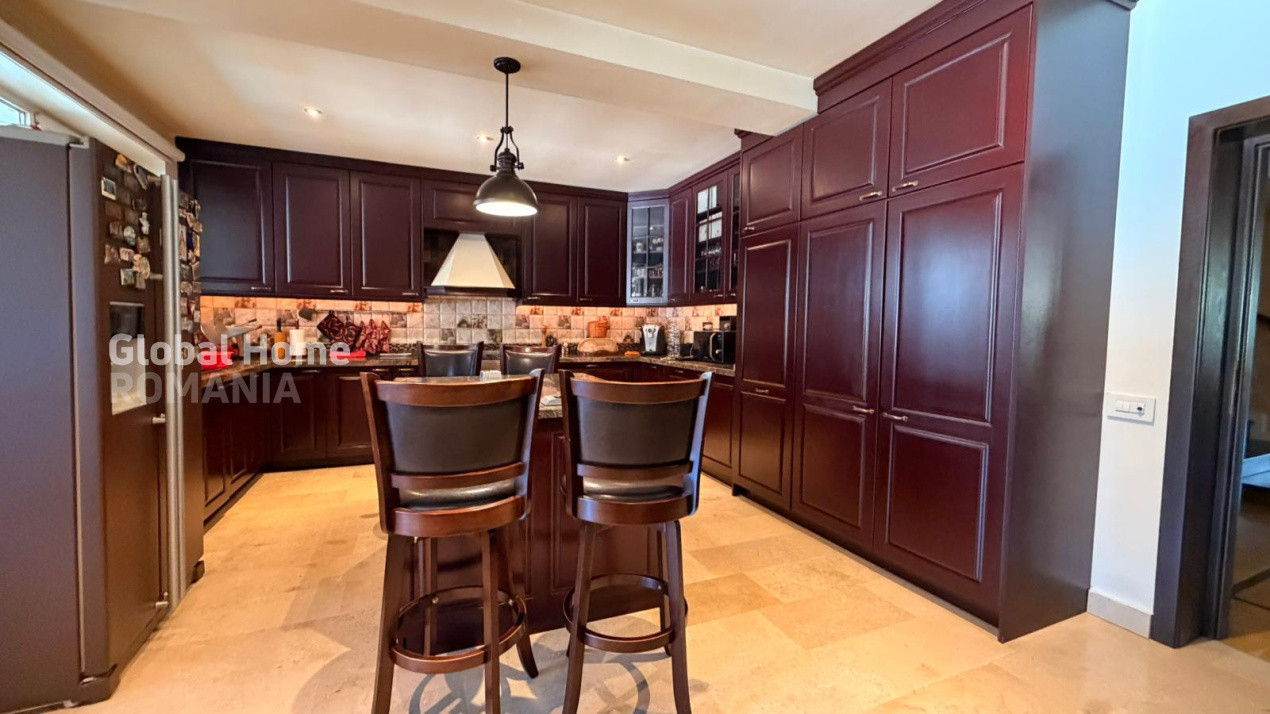 * Bucătărie de 25.8 mp, complet mobilată și utilată, cu mobilier din lemn masiv, blat de granit natural și electrocasnice de ultimă generație