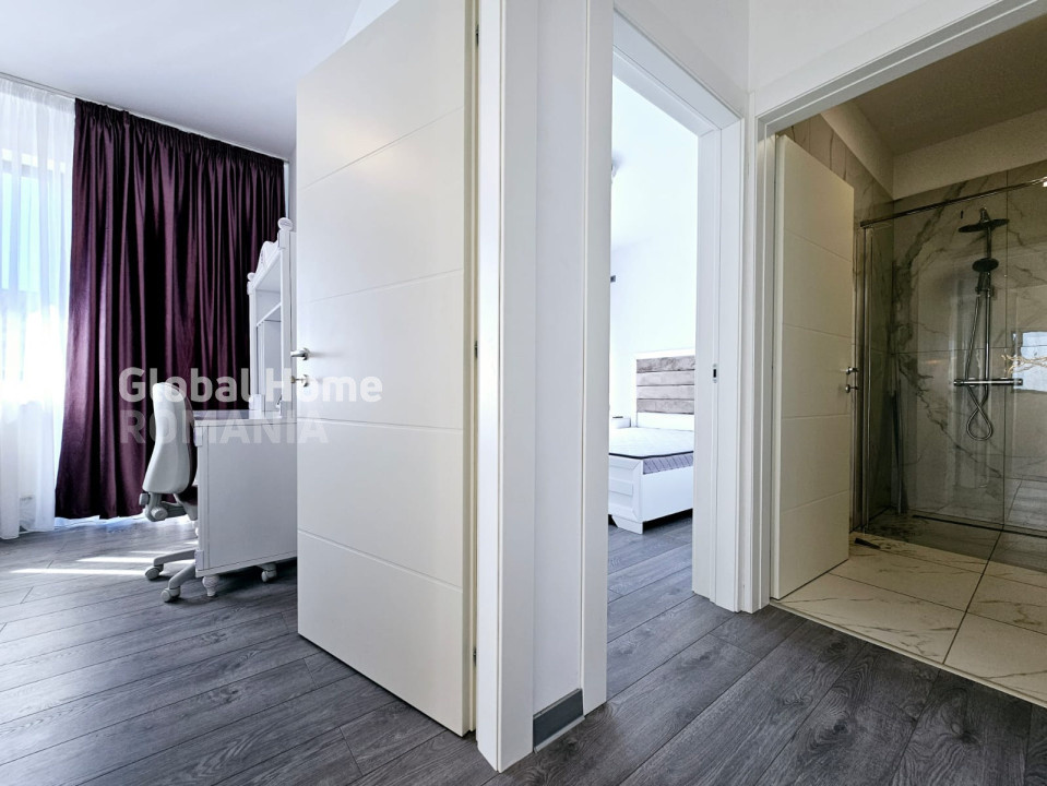 La etajul 1 avem un dormitor matrimonial cu dressing walk-in si baie proprie si alte 2 dormitoare spatioase cu acces catre balcon, ambele deservite de o baie ce poate fi accesata din hol