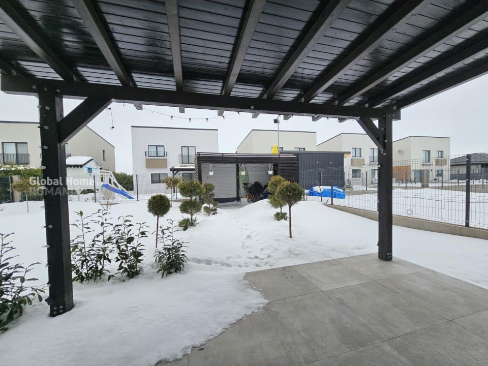 Proprietatea beneficiază de o curte liberă de aproximativ 300 mp, amenajată cu gazon și sistem de irigare automatizat, foișor și terasă acoperită de 20 mp – spațiul perfect pentru relaxare și petrecerea timpului în aer liber. Accesul auto se realizează prin poartă cu telecomandă, iar în curte sunt disponibile 2 locuri de parcare.