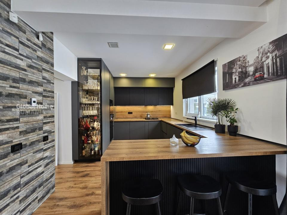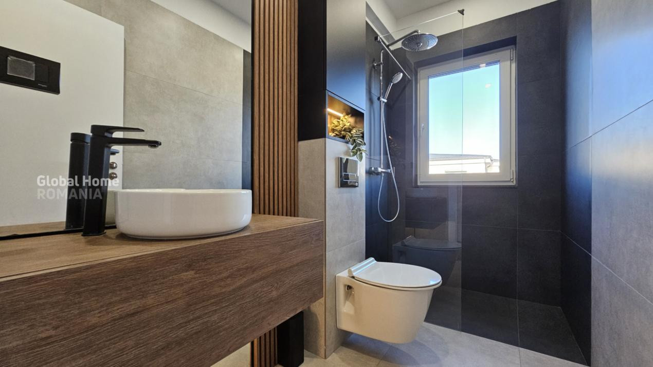 Parterul dispune de un living generos cu zonă de dining și bucătărie open space, complet mobilată și utilată cu electrocasnice premium Franke, o baie de serviciu și o cameră tehnică.