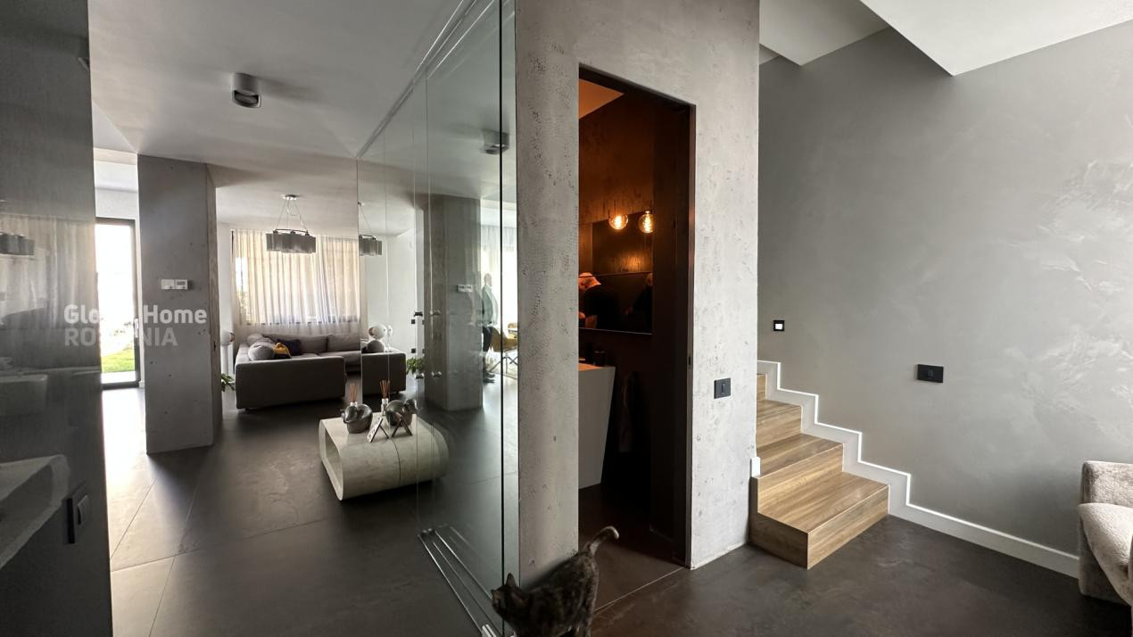 Vila are regim de înălțime P+1 și beneficiază de o compartimentare practică, cu spații generoase și luminoase, gândite pentru confortul zilnic. Zona de zi este amplasată la parter și oferă un ambient deschis și primitor, fiind compusă din hol de acces, dressing, grup sanitar și un living spațios cu zonă de dining open-space, ideal pentru relaxare sau socializare. Zonele vitrate ample asigură o lumină naturală abundentă pe tot parcursul zilei.