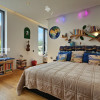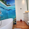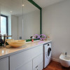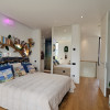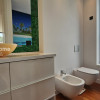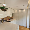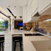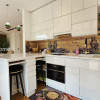 Parchet exotic Doussie în băi, sticlă printată cu motive decorative, chiuvete din piatră naturală, blat quartz premium, electrocasnice integrate de înaltă calitate
