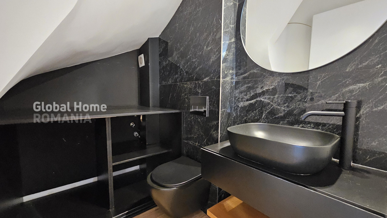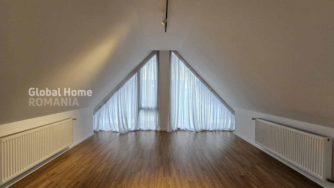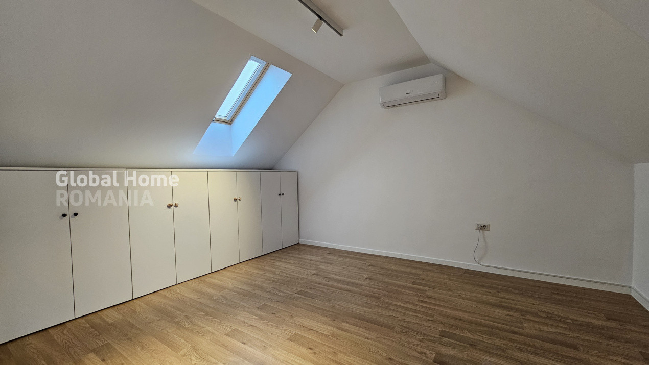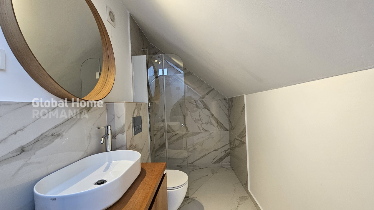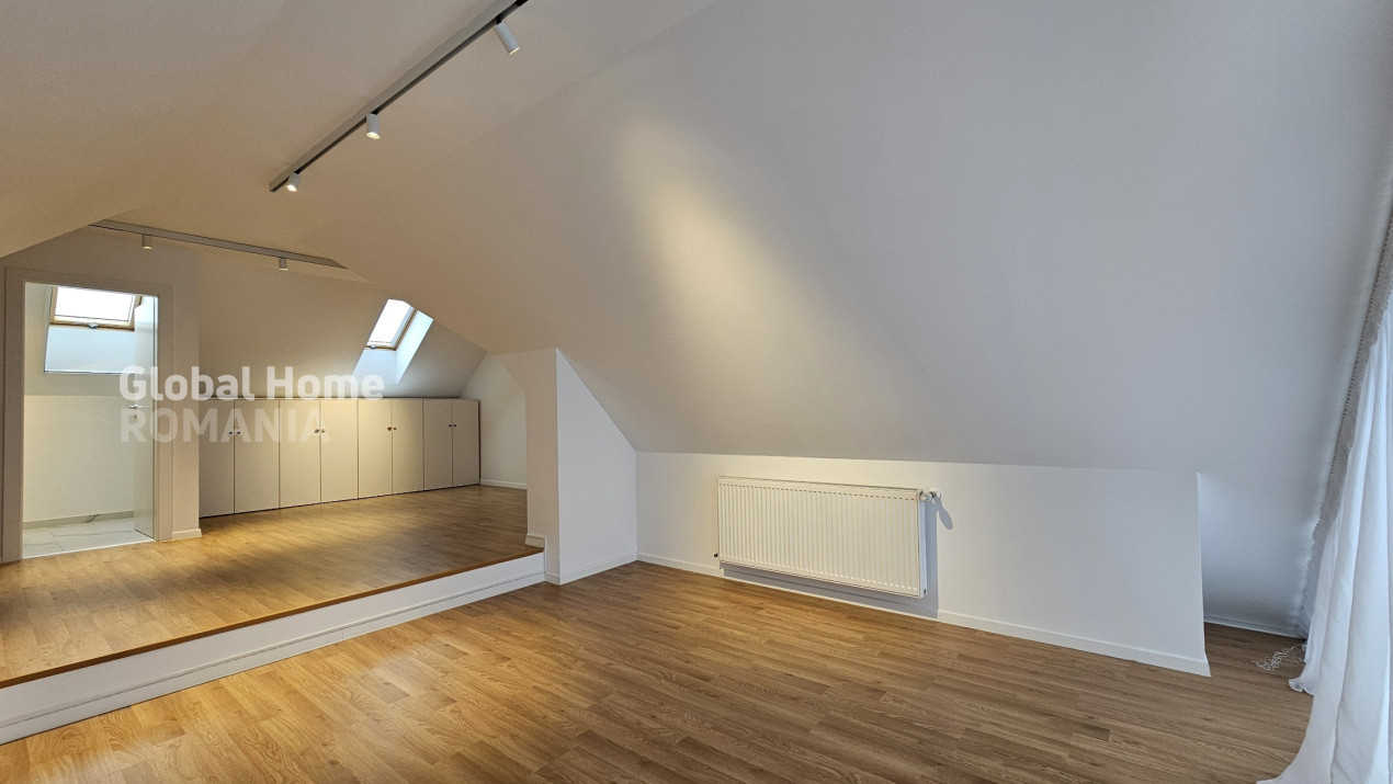 La etajul 1 avem 2 dormitoare spatioase, un dormitor transformat in dressing walk-in si 2 bai, iar mansarda este amenajată ca birou şi zonă de relaxare cu baie proprie.