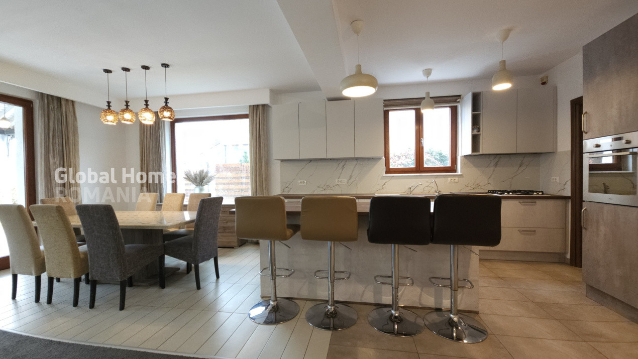 Parterul proprietatii beneficiaza de un living generos cu zona de dinning si semineu , 1 dormitor, 1 terasa , 1 bucatarie complet mobilata si utilata, vestibul si un grup sanitar. Etajul 1 dispune de un dormitor matrimonial generos, un dressing walk-in si baie proprie, 2 dormitoare spatioase si o baie aflata pe hol.