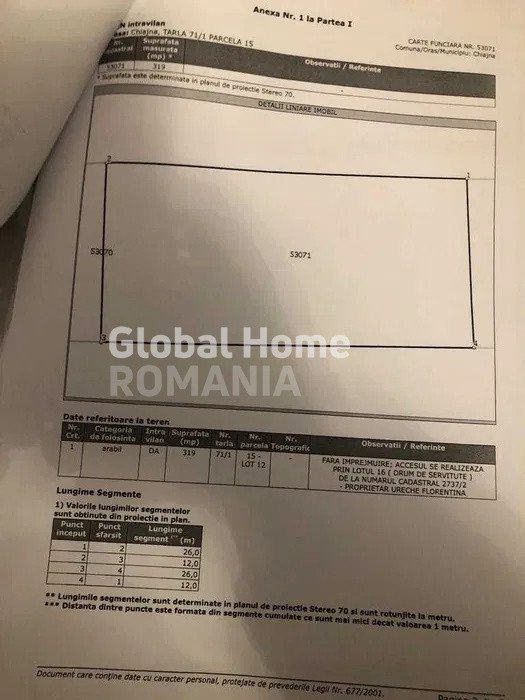 De vânzare teren intravilan, situat într-o zonă liniștită și în dezvoltare. Suprafața totală este de 400 mp, din care 319 mp sunt utili, iar 80,66 mp reprezintă drum de servitute.